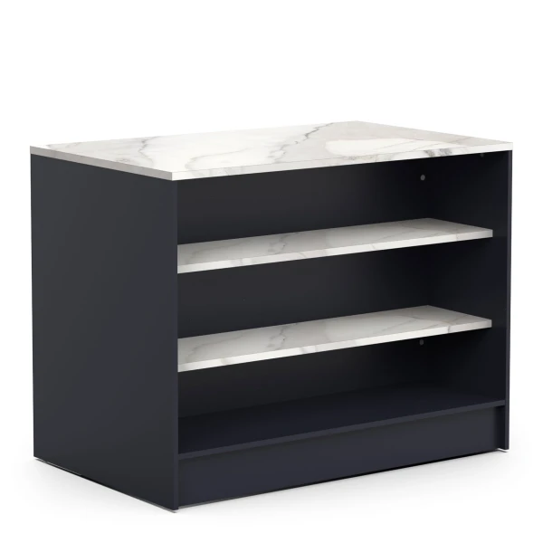 Verle Ihrem Raum eine elegante und funktionale Note mit dem Möbelstück Kücheninsel Ally! Mit einem modernen Design, das ein Indigo-Blau, Marmor und Weiß kombiniert, wird dieses Möbelstück zum Blickfang in jedem Raum. Mit großzügigen Abmessungen (120,2 cm lang) und einer robusten Spanplattenstruktur bietet es viel Stauraum für Utensilien, Zutaten und mehr. Sein vielseitiger und eleganter Stil passt perfekt zu jeder Art von Dekoration. Ideal für diejenigen, die Platz maximieren möchten, ohne das Design zu opfern. Machen Sie Ihre Küche noch heute praktischer und ansprechender!