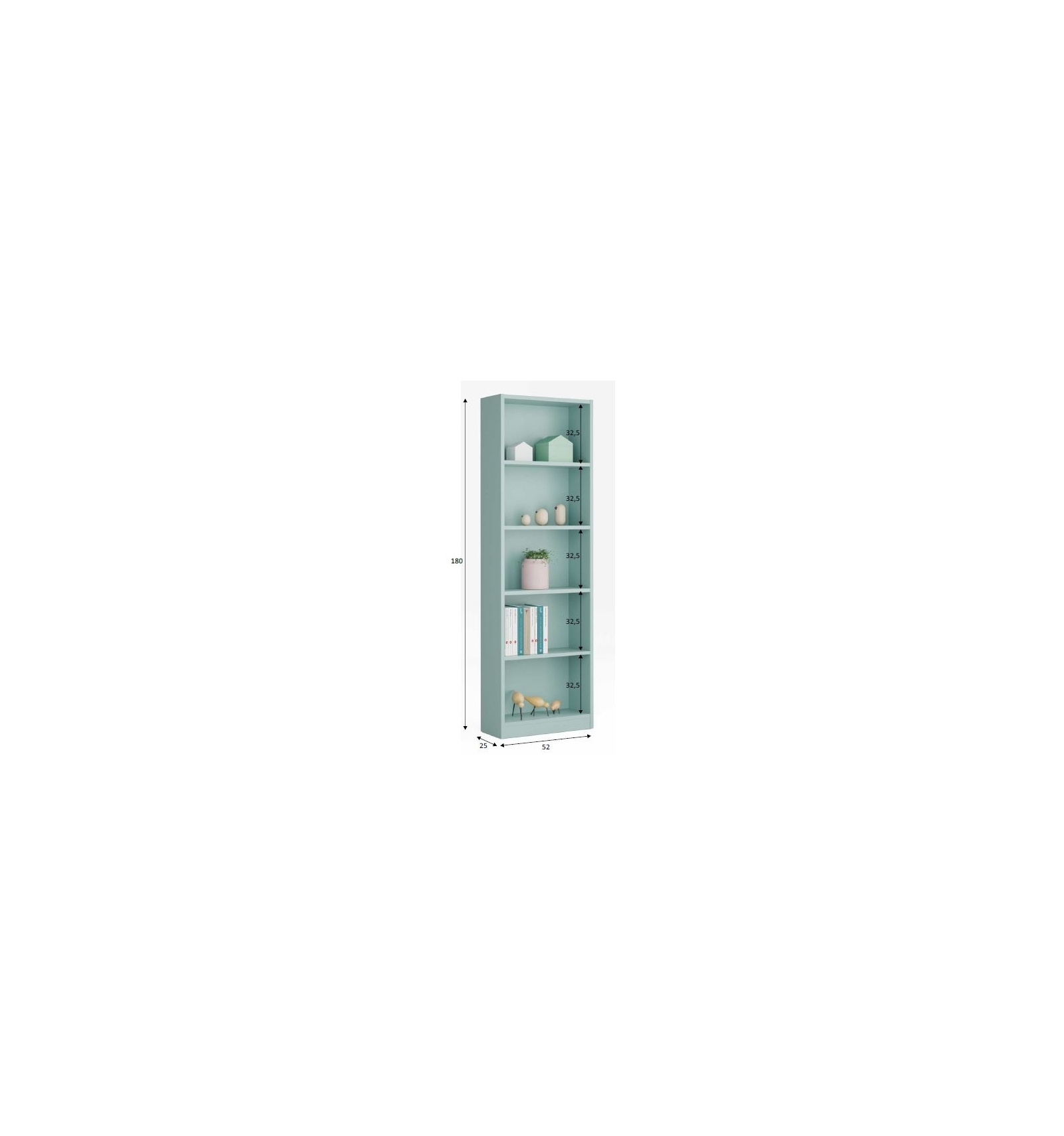 Das Standregal hat die Maße von 180 x 52 x 25 cm (H x B x T) und ist mit insgesamt sechs Regalböden ausgestattet. Damit liefert es viel Stauraum und eignet sich perfekt als Bücherregal oder Spielzeugregal für Ihr Kind.